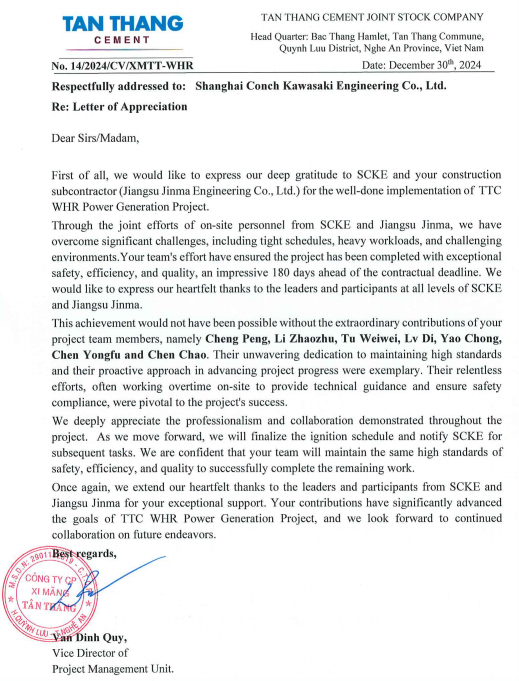 越南項目業主向海川工程公司發來感謝信