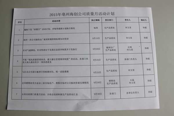 ? ? 月初,由公司領(lǐng)導(dǎo)組織相關(guān)部門研討,編制下發(fā)了2015年質(zhì)量月活動計劃。按照活動計劃的安排,公司于9月上旬對出廠板材質(zhì)量控制標準組織了研討修訂,并組織銷售人員學(xué)習(xí),提高了市場銷售人員對公司板材質(zhì)量及性能認知水平。