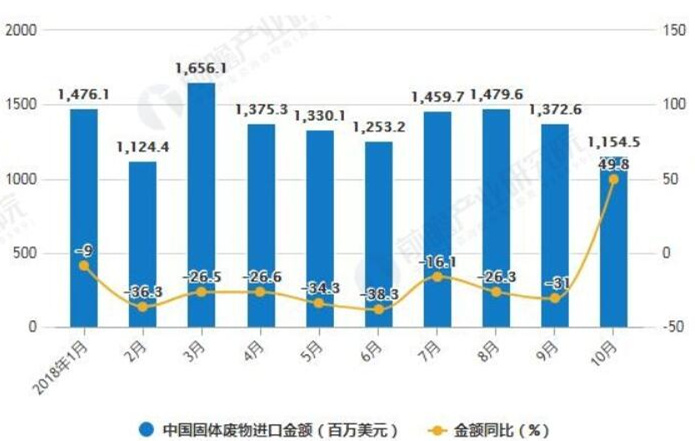 ? ? 在進(jìn)口金額方面,2018年8-9月中國(guó)固體廢物進(jìn)口金額下降,2018年10月中國(guó)固體廢物進(jìn)口金額維持下降趨勢(shì)。2018年10月中國(guó)固體廢物進(jìn)口金額為1155百萬(wàn)美元,同比增長(zhǎng)49.8%。