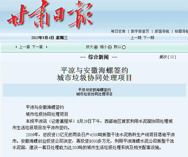 ??? 2009年,總投資15億元的兩條日產4500噸新型干法水泥熟料生產線項目落地平涼市。安徽海螺創業投資公司決定,再投資8000多萬元,利用平涼海螺水泥公司新型干法水泥窯,建設一套日處理能力達300噸的城市生活垃圾處理系統及相關配套設施。