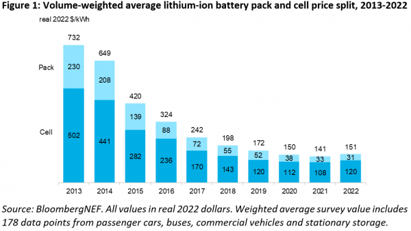 雖然近幾個月來鋰、鎳和鈷等關鍵電池金屬的價格略有放緩,但BNEF預計,2023年電池組的平均價格將保持在152美元/KWh的高位(以2022年的實際美元計算)。