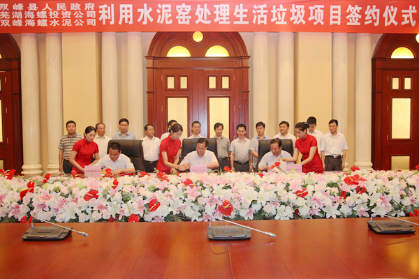 ? ? 2014年6月29日上午,雙峰縣人民政府、蕪湖海螺投資公司、雙峰海螺公司在蕪湖海螺國際會議中心東海廳正式簽署了《關于雙峰縣利用水泥窯協同處理城市生活垃圾項目合作協議》,雙峰縣縣長楊維,縣委常委、副縣長龍燕青,縣人大常委會副主任李仲喬;海螺創業總經理紀勤應、副總經理李大明;雙峰海螺副總經理萬天靜等參加了簽約儀式。